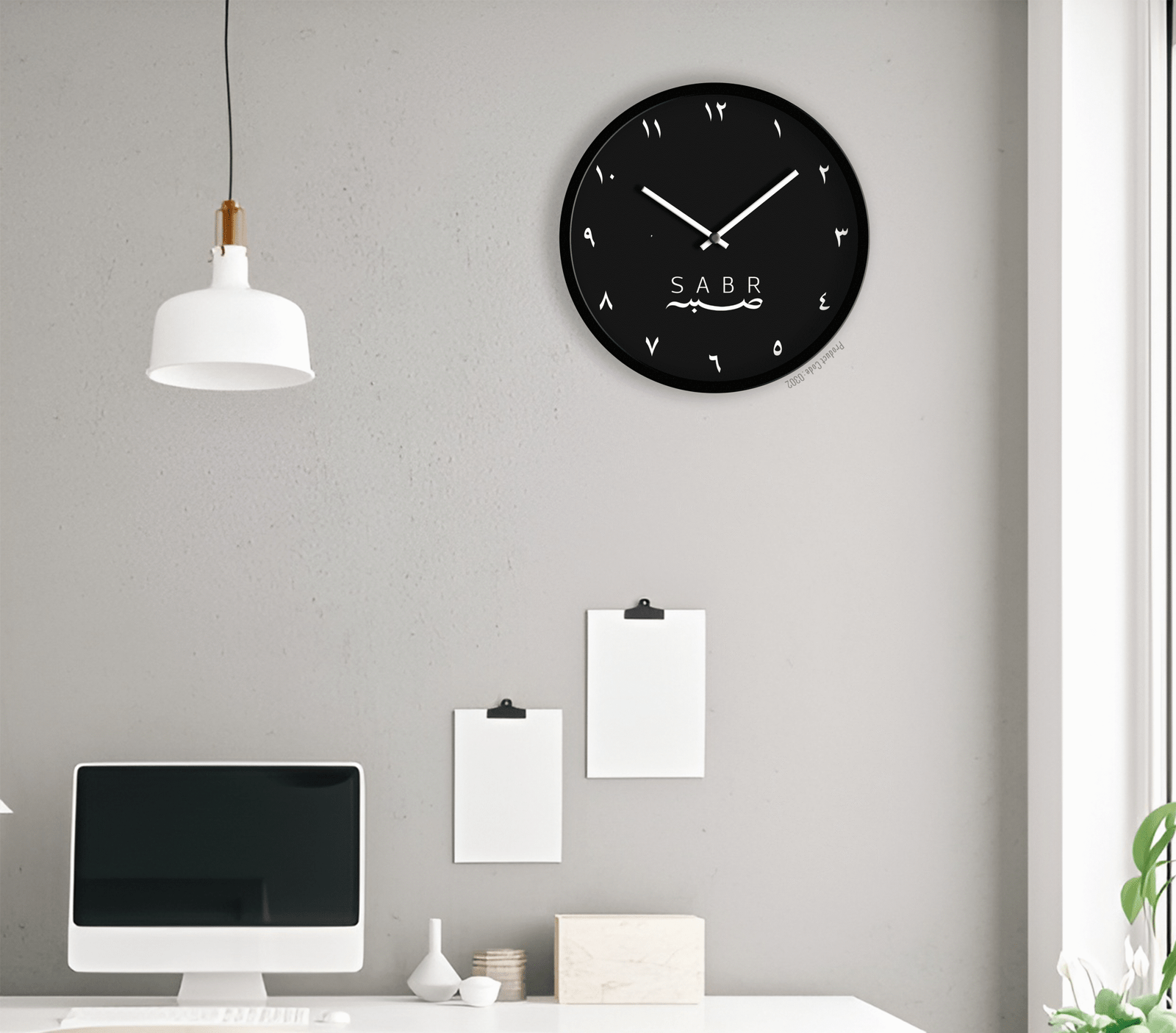 Designed with a deep matte black base, clean Arabic numerals, and the powerful word “SABR” (صبر — Be Patient) at its heart, this clock blends spirituality with modern minimalism. The contrast of white typography on black creates a bold yet calming presence on any wall.